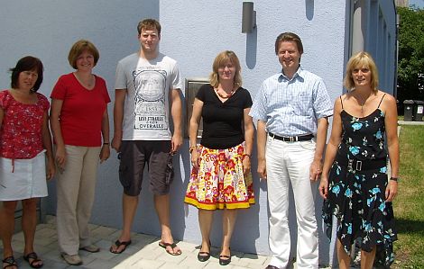 Birgitt Rupp, Bürgermeisterin Ruth Dorner, Christian Hlatky, Britta Schätzel, Ralf Mützel und Anita Dengel (v.l.) vor dem Bürgerhaus "Miteinander" in Rosenheim.