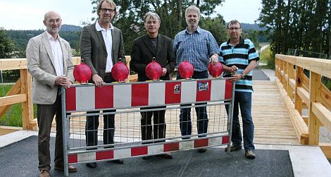 Bürgermeister Helmut Himmler dankte bei der Verkehrsfreigabe Thomas Plagemann vom Wasserwirtschaftsamt Regensburg und Willibald Schweiger von der Flussmeisterstelle Neumarkt für die Erneuerung der Brücke und sprach den Mitarbeitern des WWA ein großes Lob für den Unterhalt des Radwegs am Ludwigskanal aus.