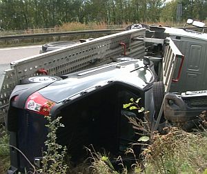 Der 43jährige rumänische Fahrer konnte das Gespann nicht mehr unter Kontrolle bringen, so dass der Lastwagen und der Anhänger nach rechts von der Fahrbahn abkamen, am Pannenstreifen umstürzten und dort zwischen Pannenstreifen und Böschung seitlich zu liegen kamen.