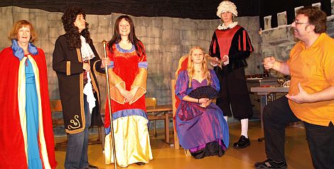 Schneewittchen als "Dienerin" der bösen Königin, die gerade vom Hoffriseur schön gemacht wird. Regisseur Guido Rind gibt letzte Anweisungen.