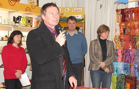 Oberbürgermeister Thomas Thumann bei seinem Grußwort. Rechts "Eine Welt Laden"-Vorsitzende und Bürgermeisterin Ruth Dorner