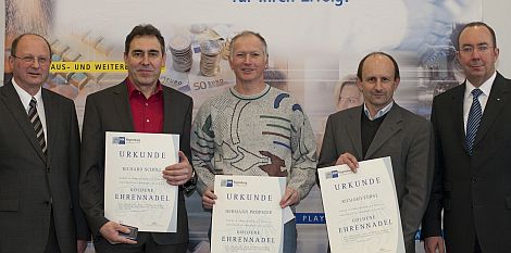 Für ihren über 20jährigen Einsatz erhielten Brigitte Bauer-Kürzdörfer, Richard Fürst, Andreas Götz, Heinrich-Karl Hartmannsgruber, Hermann Pröpster, Karl-Heinz Schmoll und Richard Schöll von IHK-Präsident Peter Esser die Goldene Ehrennadel.