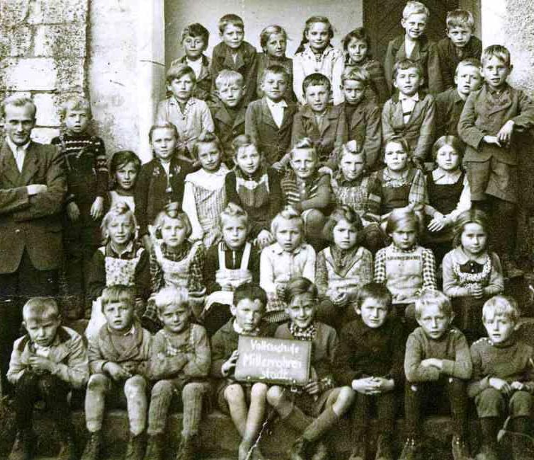 Eine Schulklasse in Mitterrohrenstadt mit Schullehrer Rehn