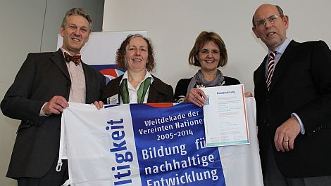 Prof. Dr. Gerhard de Haan, Vorsitzender des Nationalkomitees und der Jury der UN-Dekade in Deutschland, Projektleiterin Rosi Maier, stellvertretende Schulleiterin Astrid Kamper sowie Walter Hirche, Präsident der Deutschen UNESCO-Kommission (v.l.)