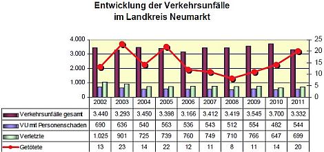 Der Trend - weniger Verkehrsunfälle aber mehr Todesopfer - war offenbar im Süden des Landkreises noch stärker ausgeprägt als im Bereich der Neumarkter Polizei. In Regensburg wurde jetzt Statistikmaterial für den Gesamt-Landkreis bekannt - also von den Polizeiinspektionen Neumarkt und Parsberg zusammen.
