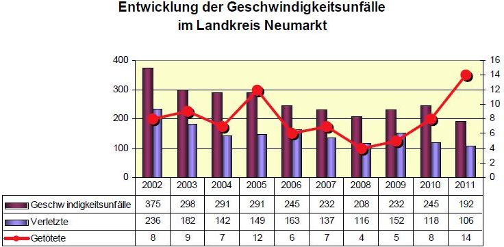 Die Zahl von überhöhtem Tempo als Unfallursache hat (wie die Gesamtzahl der Unfälle) von 245 auf 192 abgenommen, allerdings ist die Zahl der Todesopfer bei dieser Unfallursache von 8 auf 14 gewaltig angestiegen.