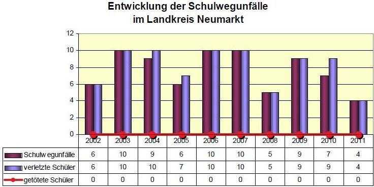 Positiv ist bei der Unfallstatistik für den Landkreis eigentlich nur die Spalte Schulwegunfälle: Vier solche Unfälle gab es im letzten Jahr, bei dem vier Schüler verletzt wurden. Beide Zahlen stellen einen historischen Tiefstand in den letzten zehn Jahren dar. Besonders erfreulich: bei Schulwegunfällen gab es wie auch in den Jahren zuvor keine Todesopfer.
