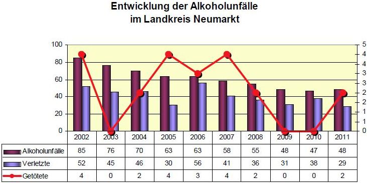 Beunruhigend ist nach vielen Jahren der stetigen Rückgänge im letzten Jahr die Entwicklung der Alkoholunfälle. Deren Zahl stieg zum ersten Mal nach neun Jahren wieder an. Zwei Menschen starben dabei - in den letzten Jahren gab es keine tödlichen Unfälle, an denen Alkohol schuld war.