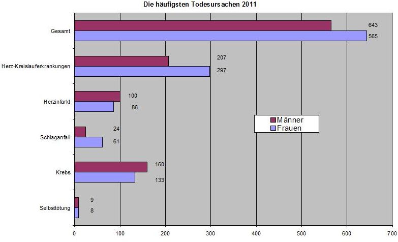 An Herz-Kreislauferkrankungen starben insgesamt 504 Menschen, 207 Männer und 297 Frauen. Bei den 186 Herzinfarkten waren es deutlich mehr Männer, während bei den 85 Schlaganfällen die Frauen in Überzahl waren.