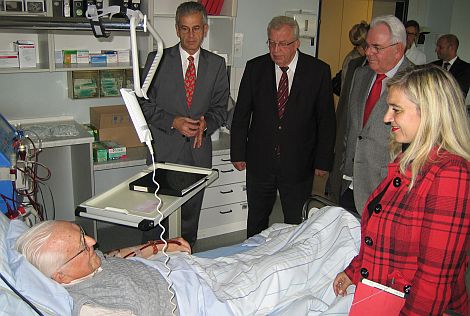 Besucher am Krankenbett (v.l.): Dr. Josef Wopperer, Landrat Albert Löhner, Dr. Rolf Pilgrim und Staatssekretärin Melanie Huml