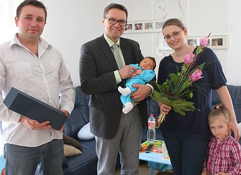 Als kleine Erinnerung überreichte Brandenburger der jungen Familie, Blumen, eine Flasche Rotwein und einen Gutschein für die Erstausstattung von Kirian.