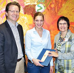Bachelorabsolventin Ilona Blomeier (Mitte) überreicht ihre