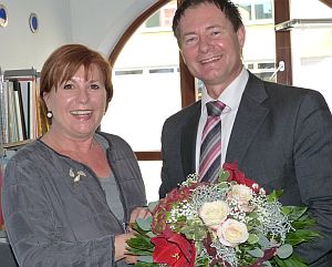 NEUMARKT. OB Thomas Thumann hat sich von der langjährigen Leiterin des Kulturamtes der Stadt, Dr. Gabriele Moritz, mit einem Blumenstrauß verabschiedet.