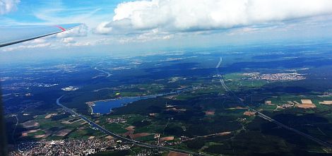 Als auch der Motorsegler mit Schlepppilot Kurt Sternecker einsatzbereit war, ging es gegen elf Uhr in die Lüfte. Der erste Thermikanschluss war schnell gefunden und brachte Michael Wagner nach dem Ausklinken auf eine Ausgangshöhe von 1200 Meter über dem Ottenberg. Es ging Richtung Süden vorbei an Neumarkt, Berching und Beilngries. Von da führte die Strecke die Altmühl entlang nach Riedenburg und Kelheim, wo an der Befreihungshalle der erste Wendepunkt erreicht war.
