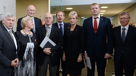Alois Karl (l.) und der Präsident des Deutschen Bundestages Norbert Lammert (4.v.l.) eröffneten mit den jeweiligen Vorsitzenden der Parlamentariergruppen und Botschaftern von Estland, Litauen und Lettland die Ausstellung