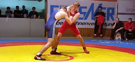 Den Kampf es Abends lieferte Thomas Kleesattel, der seinen Gegner nach einigen technischen Feinheiten des Ringersports unter dem Jubel der Fans in der vollen Halle schulterte.