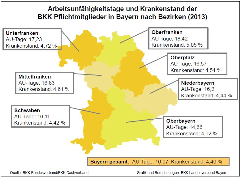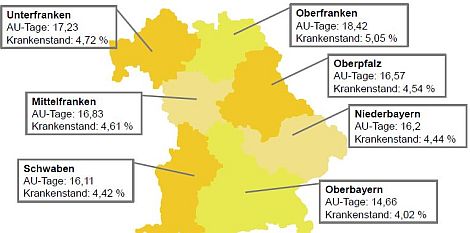 Auf Bezirke hochgerechnet führen die Oberfranken die BKK-Arbeitsunfähigkeitsstatistik insgesamt mit 5,05 Prozent an. Auch die Unterfranken (4,72 Prozent) und die Mittelfranken (4,61 Prozent) sind vergleichsweise häufig krank. Die Oberbayern (4,04 Prozent) und die Schwaben (4,41 Prozent) haben die niedrigsten Krankenstände. Im Mittelfeld mit ihren Krankenständen liegen Niederbayern (4,44 Prozent) und die Oberpfalz (4,54 Prozent).