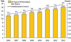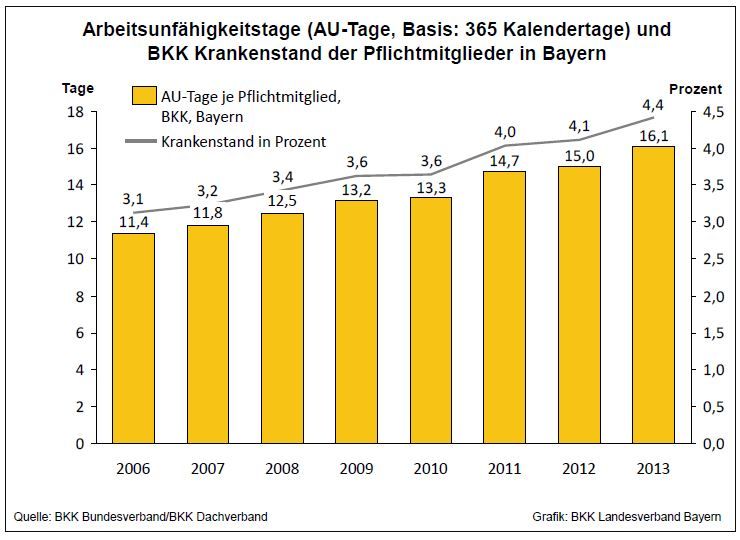 Diese Zahlen gehen aus der Arbeitsunfähigkeitsstatistik von 850.000 Pflichtmitgliedern der Betriebskrankenkassen (BKK) in Bayern aus dem Jahr 2013 hervor.