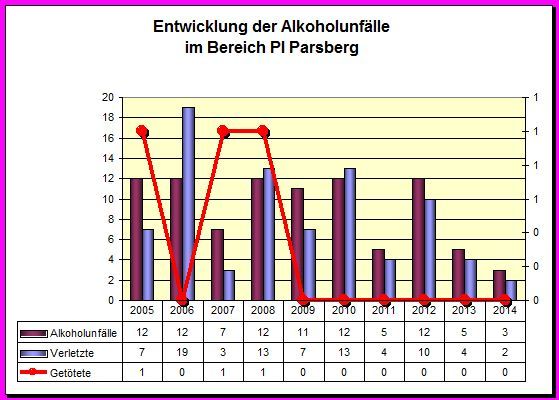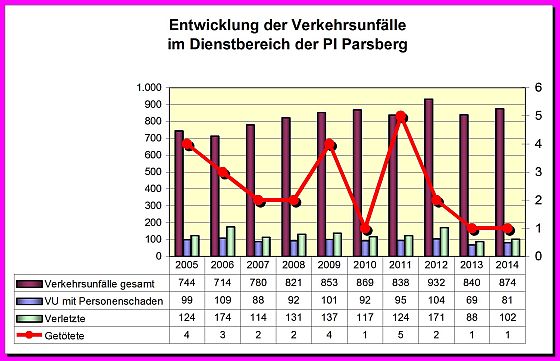 Im vergangenen Jahr wurde bei einem (drei) Schulwegunfall eine Schülerin leicht verletzt. Eine zehnjährige Schülerin hatte die Bahnhofstraße in Parsberg unvorsichtig überquert und war gegen ein Auto gelaufen. Glücklicherweise war nur eine leichte Schürfwunde die Folge.