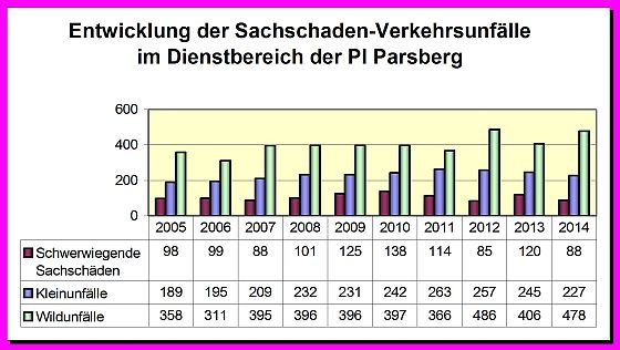 Die Kleinunfallzahlen - also Unfälle mit geringfügigen Rechtsverstößen und geringem Schaden, sowie Wildunfälle - zeigen sich mit 705 Unfällen (651) um 6,1 Prozent leicht ansteigend.