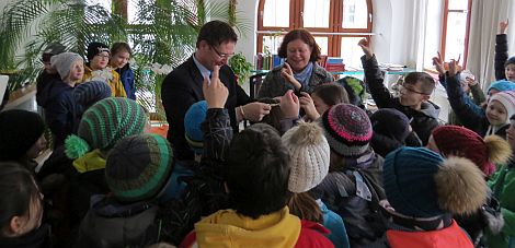 Ein Höhepunkt des Besuchs war die Möglichkeit, kurz bei Oberbürgermeister Thomas Thumann in seinem Amtszimmer vorbeizuschauen. Begeistert stürmten die Viertklässler das Büro des Stadtoberhauptes und löcherten ihn mit Fragen. Diese reichten von der nach dem Alter des Oberbürgermeisters über die Nachfrage, wie lange der Arbeitstag eines Oberbürgermeisters ist bis zu der, ob er eine Amtskette besitze. Oberbürgermeister Thumann holte dazu prompt die Amtskette aus ihrem Verwahrort und zeigte sie den Schülern. Die Kette aus dem Jahr 1906 hat übrigens Prinz Ludwig anlässlich seines Besuches der Stadt geschenkt.