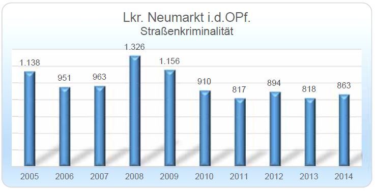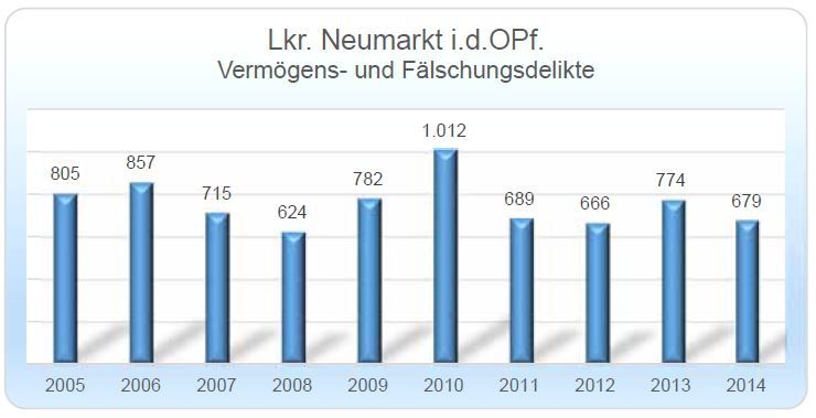 Das wurde bei der Präsentation des "Sicherheitsberichts 2014" bekannt, der am Mittwoch-Nachmittag in Regensburg vorgestellt wurde. Die Zahl der Straftaten im Landkreis Neumarkt ist dabei - von einem sowieso schon niedrigem Stand - um 7,2 Prozent auf 3783 Taten gesunken. Damit liegt die sogenannte "Häufigkeitszahl" - die Zahl der Straftaten pro 100 Einwohner - erstmals bei unter 3 (genau 2,959).