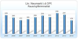 Oberpfalzweit macht nach den Worten des Polizeipräsidenten auch die Rauschgift-Kriminalität zu schaffen. Hier steuerte der Landkreis Neumarkt aber gegen den Strom: die Zahl der Drogen-Delikte ist hier um fast ein Drittel auf 170 Fälle zurückgegangen. Der Landkreis weist hier mit deutlichem Abstand den niedrigsten Wert der letzten zehn Jahre auf.