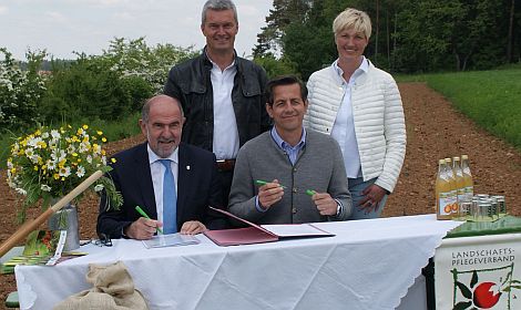 Die Begeisterung für die Kartoffel teilen die beiden neuen Partner schon lange, jetzt teilen sie diese Begeisterung für ein echtes Oberpfälzer Grundnahrungsmittel auch ganz offiziell: am Frreitag besiegelten Timo Burger und Christina Dietmayr von der Burgis-Geschäftsführung, Landrat Willibald Gailler und Werner Thumann, der Geschäftsführer des Landschaftspflegeverbands Neumarkt, mit der offiziellen Vertragsunterzeichnung die Partnerschaft zwischen dem Landschaftspflegeverband und dem Neumarkter Kartoffelspezialisten.