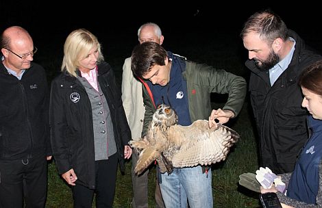 Am Mittwoch entließ die Bayerische Umweltministerin Ulrike Scharf den verwaisten Jung-Uhu bei Beratzhausen im Landkreis Regensburg wieder in die Freiheit. Das Muttertier wurde ganz in der Nähe im Juni mit dem verbotenen Gift Carbofuran getötet. Aktive des LBV machten sich auf die Suche und konnten den halb verhungerten Jungvogel der bedrohten Art retten.