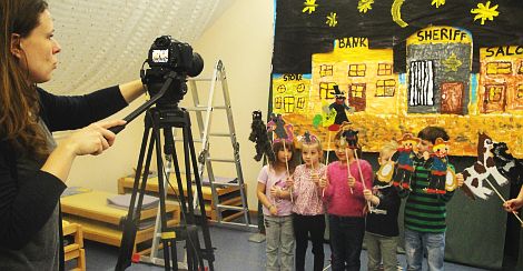Im Oktober war Start für das Filmprojekt. Seither haben die Vorschulkinder mit ihren Betreuerinnen Nicole Waas und Gudrun Eichholz viel über die Hintergründe des Filmemachens erfahren. „Filmarbeit ist Teamwork“ jedes Kind hat eine spezielle Aufgabe - ob als Geschichtenerfinder, Malerkind, Filmkind, Sprecherkind oder Geräuschemacher.