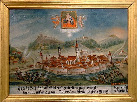 Auch ein Votivbild erinnert im Stadtmuseum an die Tat des Torschmieds. Zum Dank dafür, dass ihre Häuser vor der Zerstörung bewahrt blieben, hatten Bürger des Viehmarkts das Bild 1796 gestiftet.