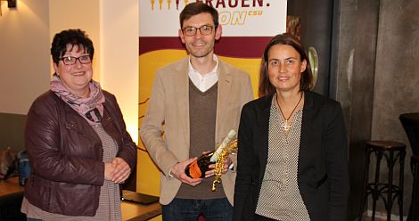 Passend zum Namen der Veranstaltungsreihe überreichten FU-Kreisvorsitzende Heidi Frank (l.) und FU-Ortsvorsitzende Birgit Gärtner an den Referenten Michael Dominik eine Flasche Prosecco