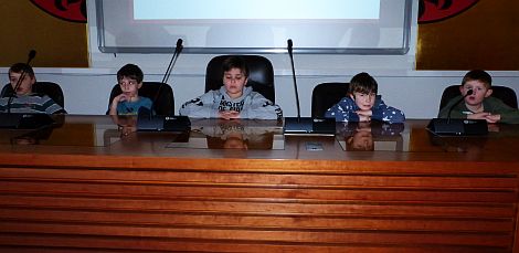 Verwaltungsrat Thomas Thumann begleitete die Kinder auf einer Erkundung des Sitzungssaals, wo sie sich auf Stühle setzen durften, auf denen sonst bei einer Stadtratssitzung auch der Oberbürgermeister oder die Bürgermeister ihren Platz haben.