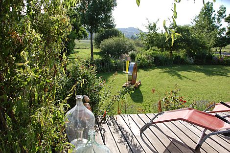Seit 2010 wohnen sie in ihrem Haus mit dem toskanischem Flair. Im Jahr darauf wurden die Freiflächen um das Haus gestaltet. Dabei sollte Haus und Garten eine Einheit werden. Darüber hinaus korrespondiert der Garten mit der Obstwiese und den Bäumen auf dem angrenzenden Gemeindegrund. Zu den Pastelltönen am Haus und den roten Holzfarben wurden rotlaubige Gehölze wie Blutpflaume oder rote Zellernuss ausgewählt.