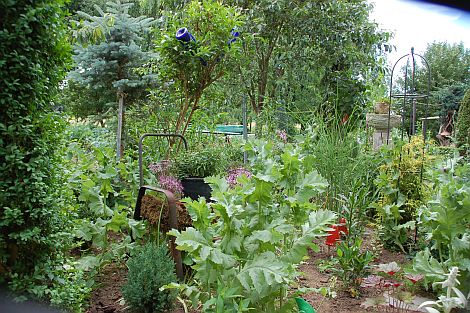 Die organischen Abfälle aus dem Garten werden kompostiert und dienen den Kulturen als Dünger. Zusätzlich Mist und frische Eier liefern die Hühner, die in einer Ecke des Gartens gehalten werden und den Garten beleben.