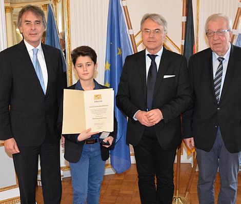 Regierungspräsident Axel Bartelt zeichnete Samuel Fernandes aus; stellvertretender Landrat Helmut Himmler und Bürgermeister Albert Löhner (v.l.) gratulierten