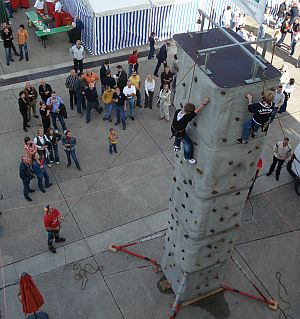 In Team-Wettkämpfen maß sich die Europoles-Belegschaft im Basketball, Torwandschießen und Ringewerfen. Außerdem sorgte der Deutsche Alpenverein mit seinem Kletterturm dafür, dass keine Langeweile aufkam. Der Renner bei den Kindern war die mit 130 Quadratmetern Grundfläche wahrlich gigantische Hüpfburg und das Kinderschminken. Am Abend schwang die Tanztruppe "Magic Butterflys" vom FörderCentrum ihre brennenden Fackeln und sorgte damit für Stimmung.