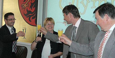Zusammen mit Projektleiterin, BTV-Vizepräsidentin Sylvia Högele, erheben die Vertragspartner ihr Gläschen auf ein gutes Gelingen der "Kinder Turn Olympiade 2008".