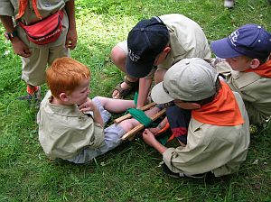 Darunter waren Aufgaben wie das Erkennen von Wegzeichen, Arbeiten mit Karte und Kompass sowie Erste Hilfe. Außerdem galt es an einer der Stationen die bekannten Lagerbauten, wie Aussichtstürme, Drei-Bein-Masten und Tore aus Holz und Seil im Miniaturformat zu bauen.