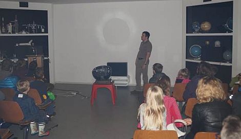Im Vortragsraum erklärte Andreas Leonhardt in einem Vortrag das Sonnensystem. Gerald Reiser zeigte auf dem Parkplatz das Größenverhältnis der einzelnen Planeten und Sonne und ließ die jungen Akteure die exakten Abstände zueinander festlegen. In der Kuppel wollte Benedikt Schnuchel die Sonne mit dem Hauptteleskop zeigen, was durch das schlechte Wetter zunächst verhindert wurde. Da musste die Kirche aus St. Helena und die Windräder in der Region herhalten.